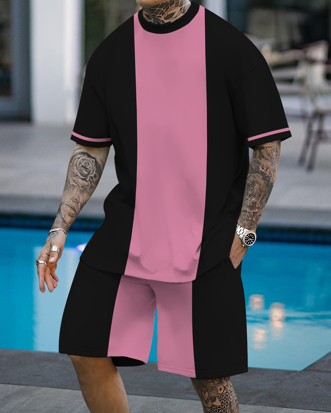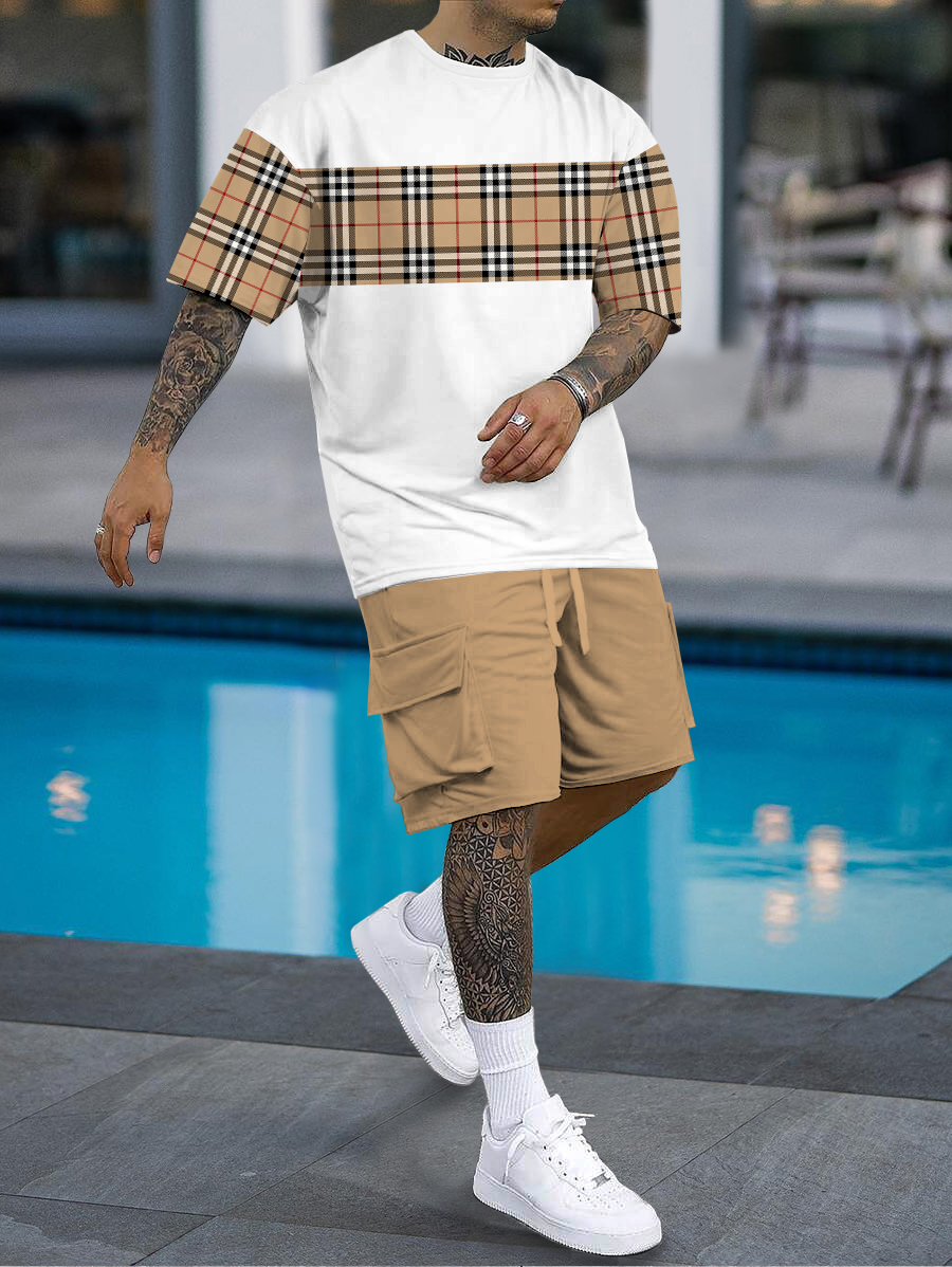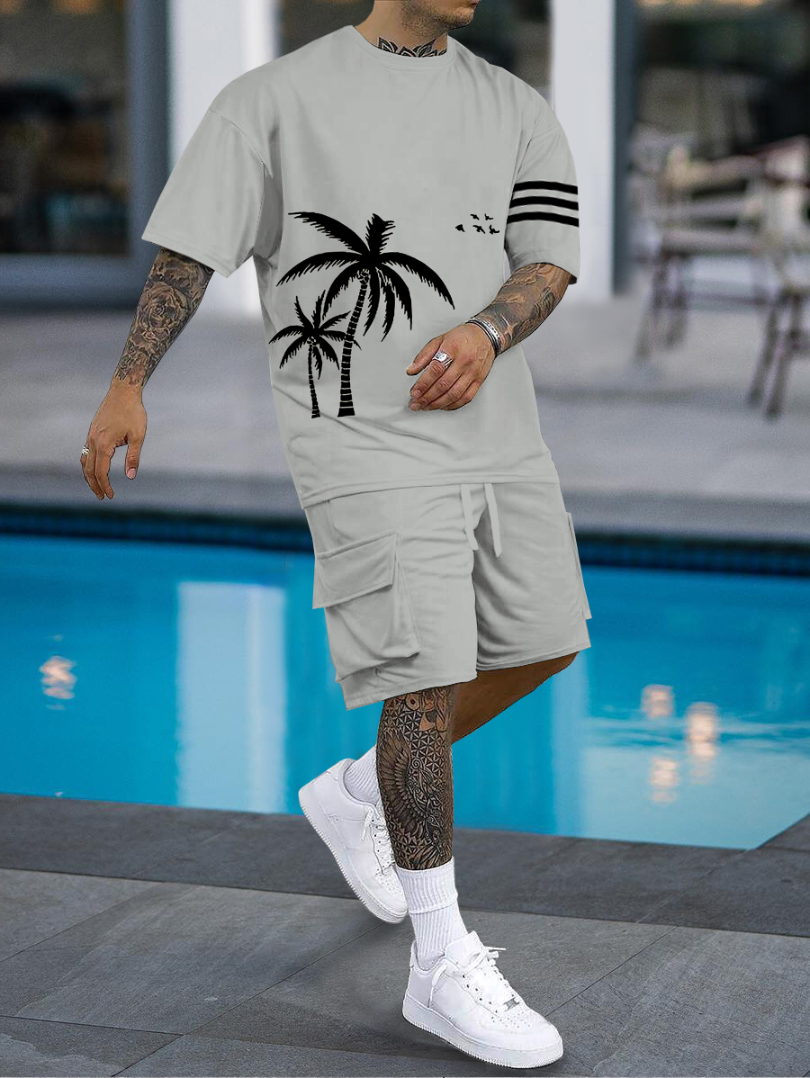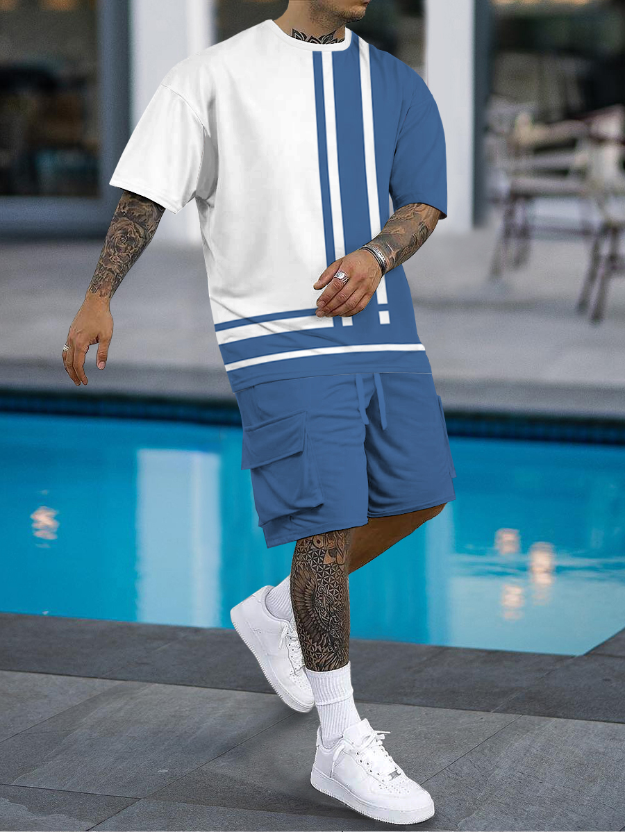 Men's fashion casual color matching printed short sleeve pocket shorts two-piece set