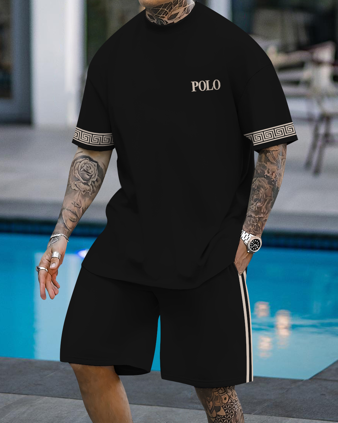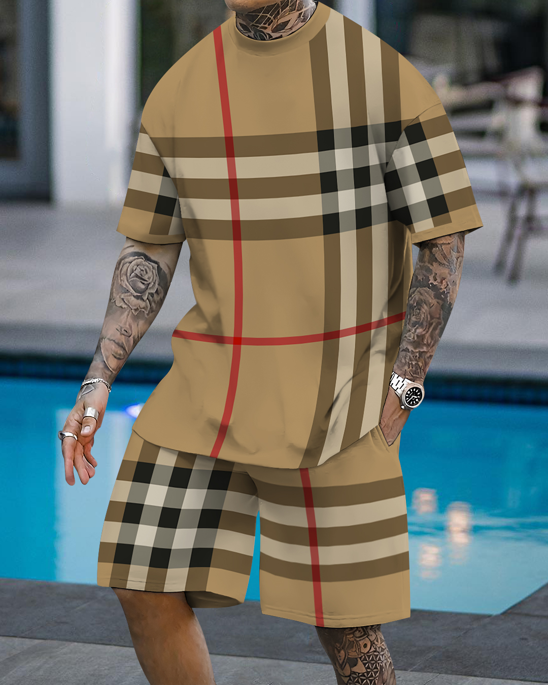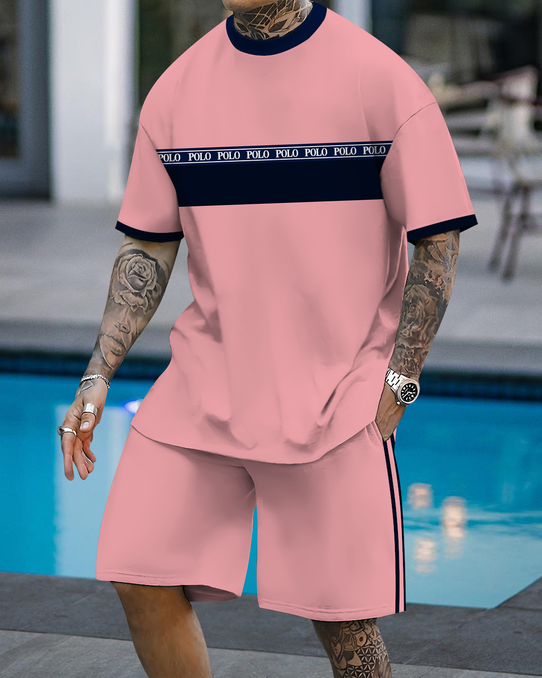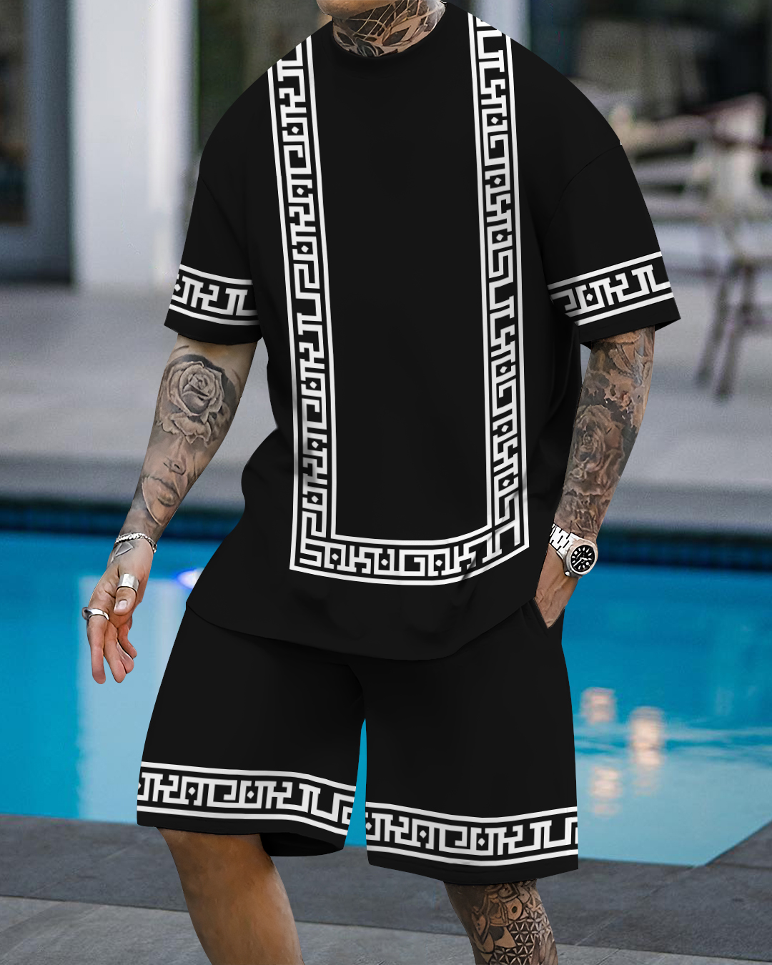 Men's fashion casual color matching printed short sleeve pocket shorts two-piece set