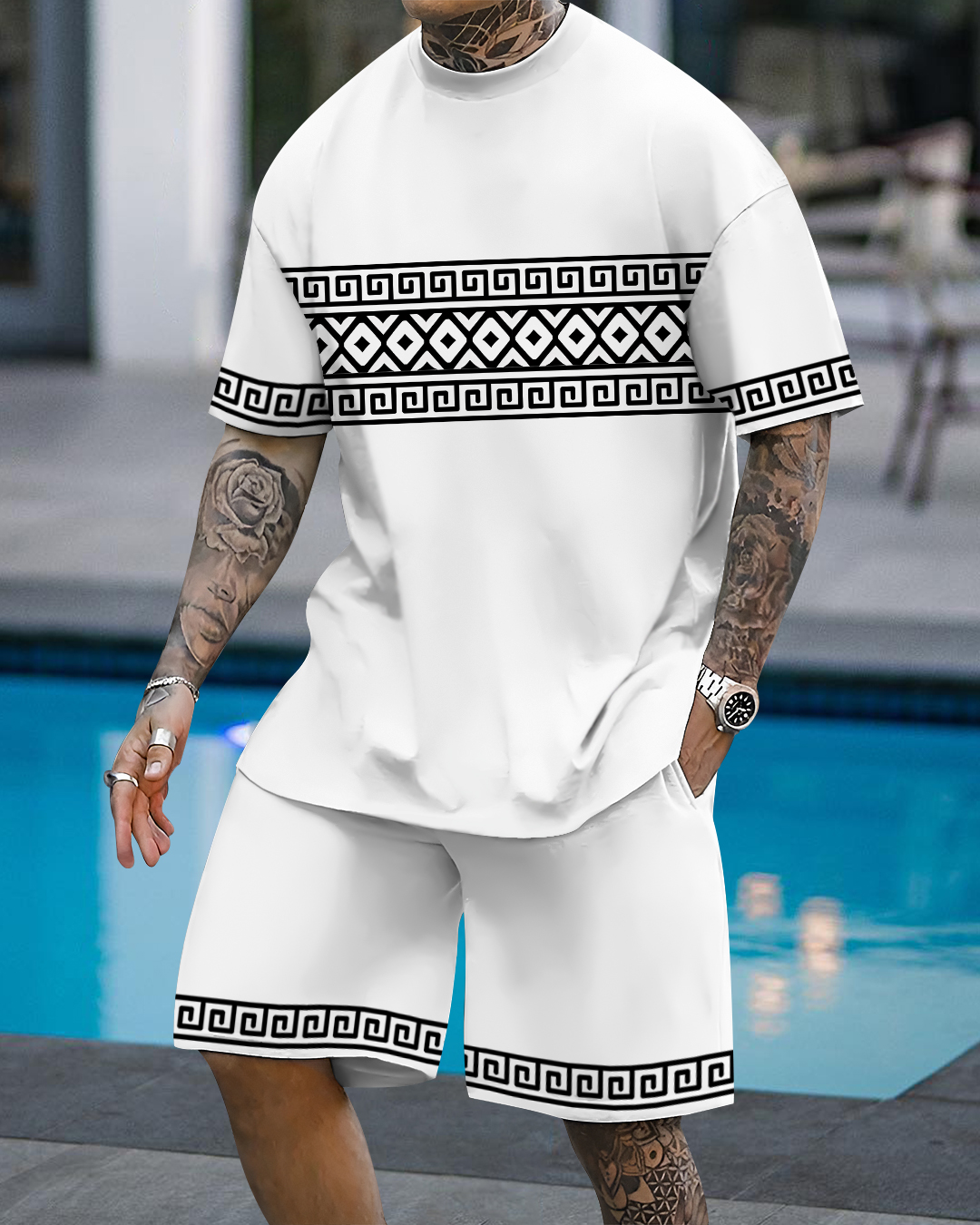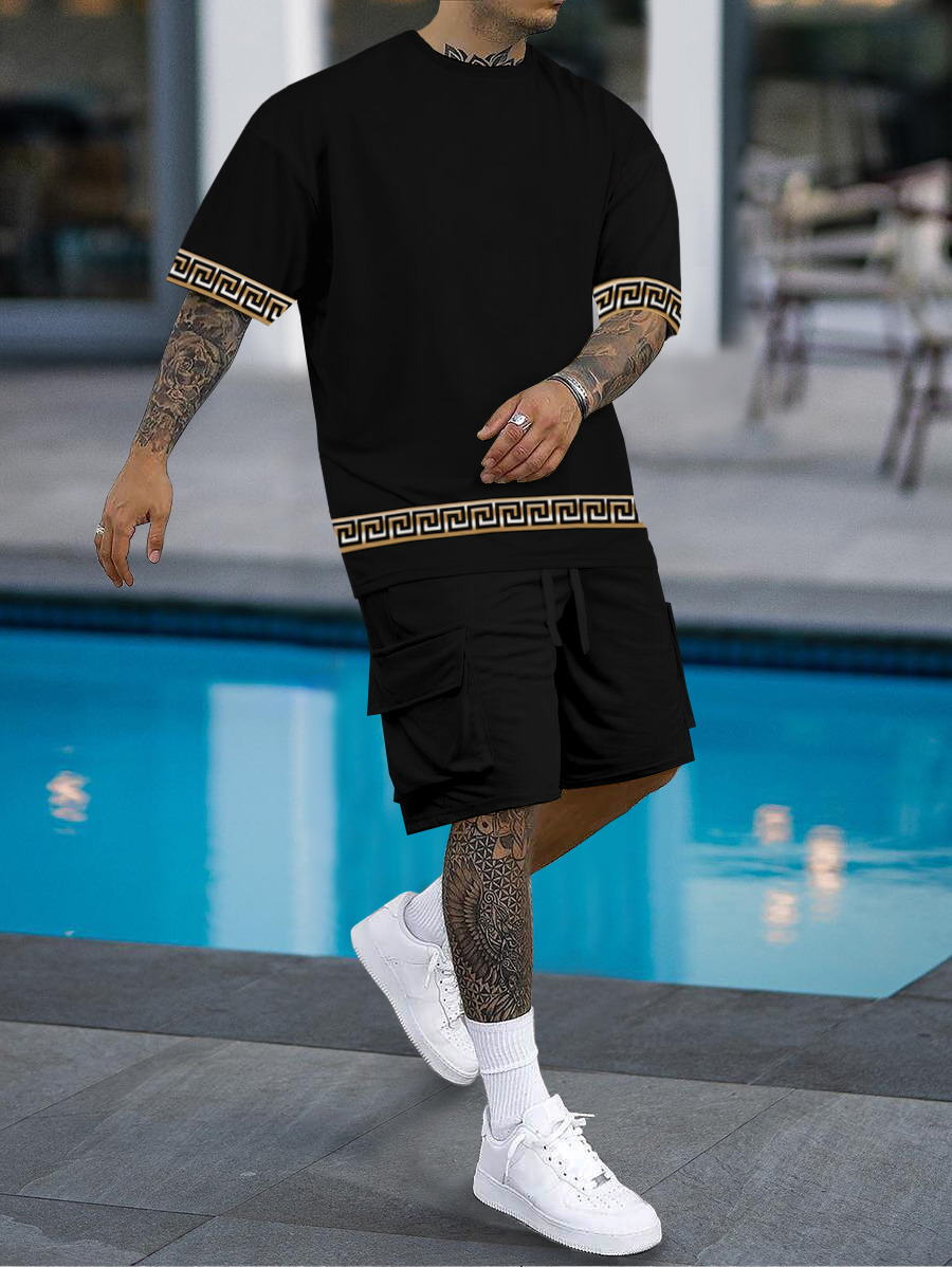 Men's fashion casual geometric print short sleeve two-piece set