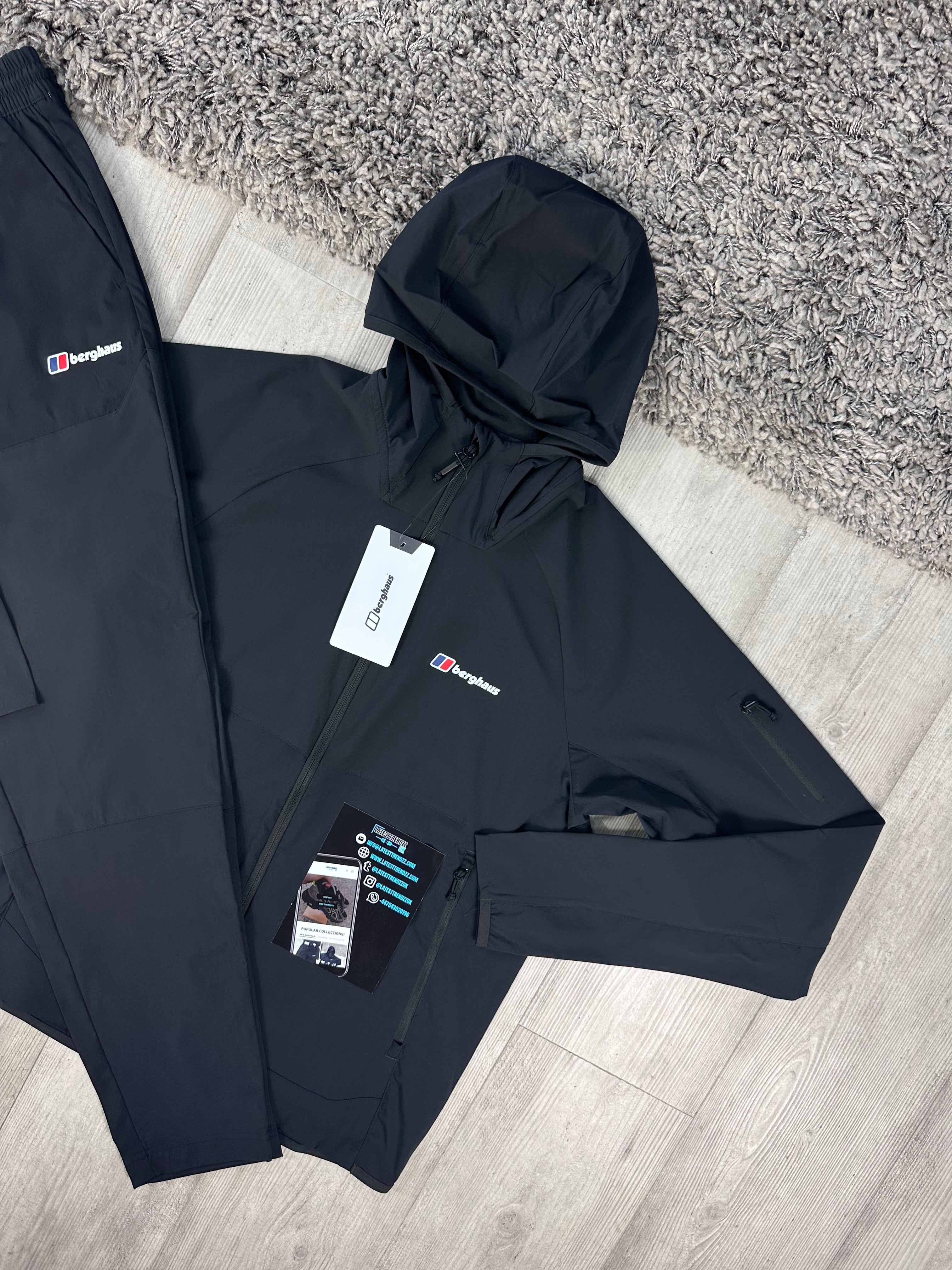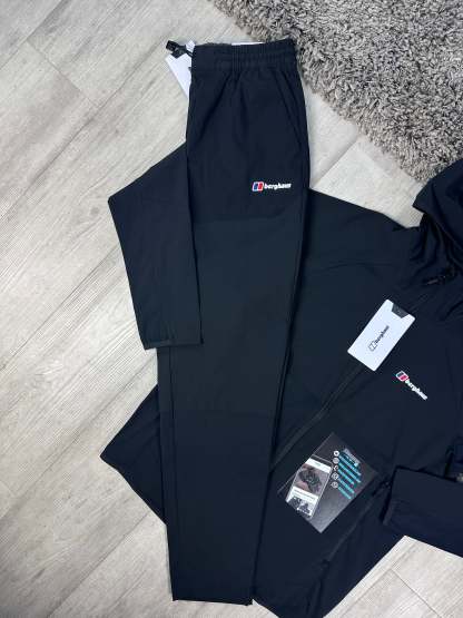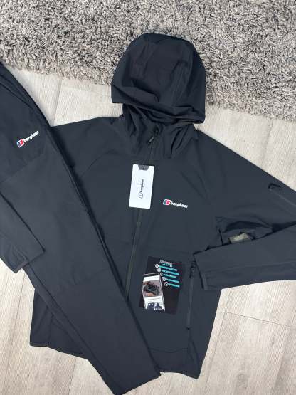 The BERGHAUS THERAN TRACKSUIT in black combines practical outdoor functionality with everyday comfort. Made with a durable fabric, it provides warmth without bulk. The full zip design is perfect for layering in unpredictable weather, while the added hood offers extra protection. Its versatile design includes an adjustable waistband, multiple pockets, open hems, and Berghaus branding.